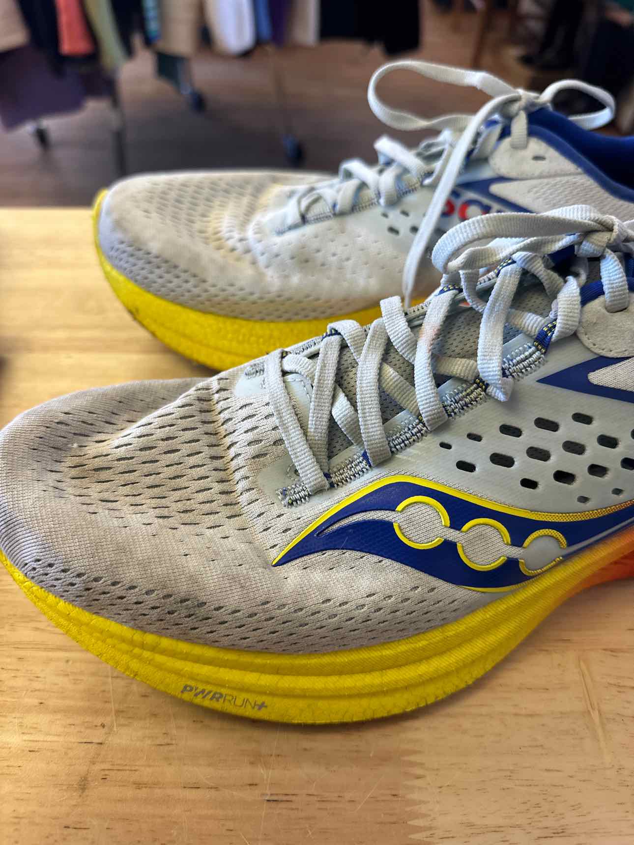 Saucony Ride 17 shoes. Grey, blue, yellow and red. size 11