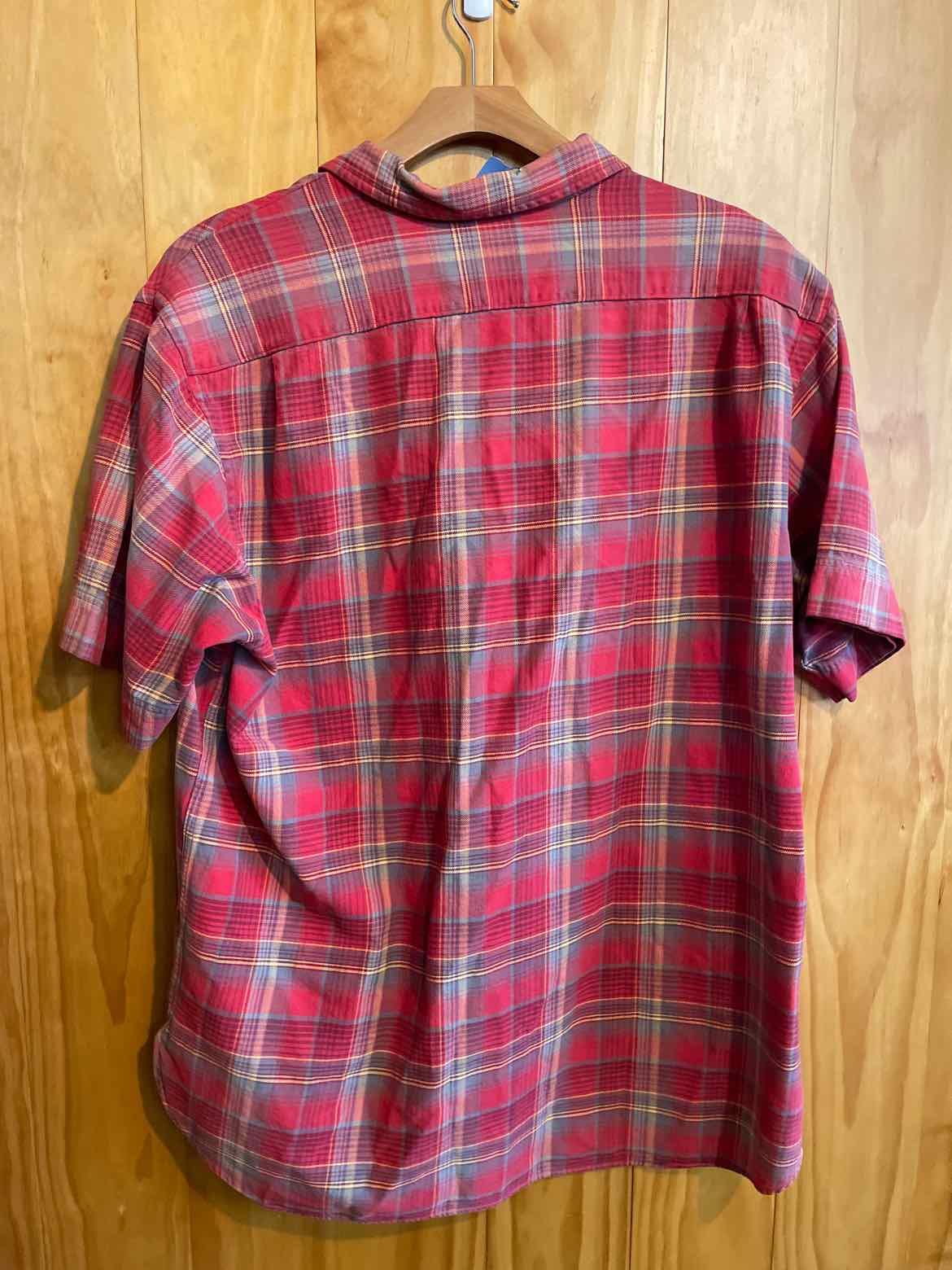 Red, yellow and grey plaid short sleeve button down with pocket. no size