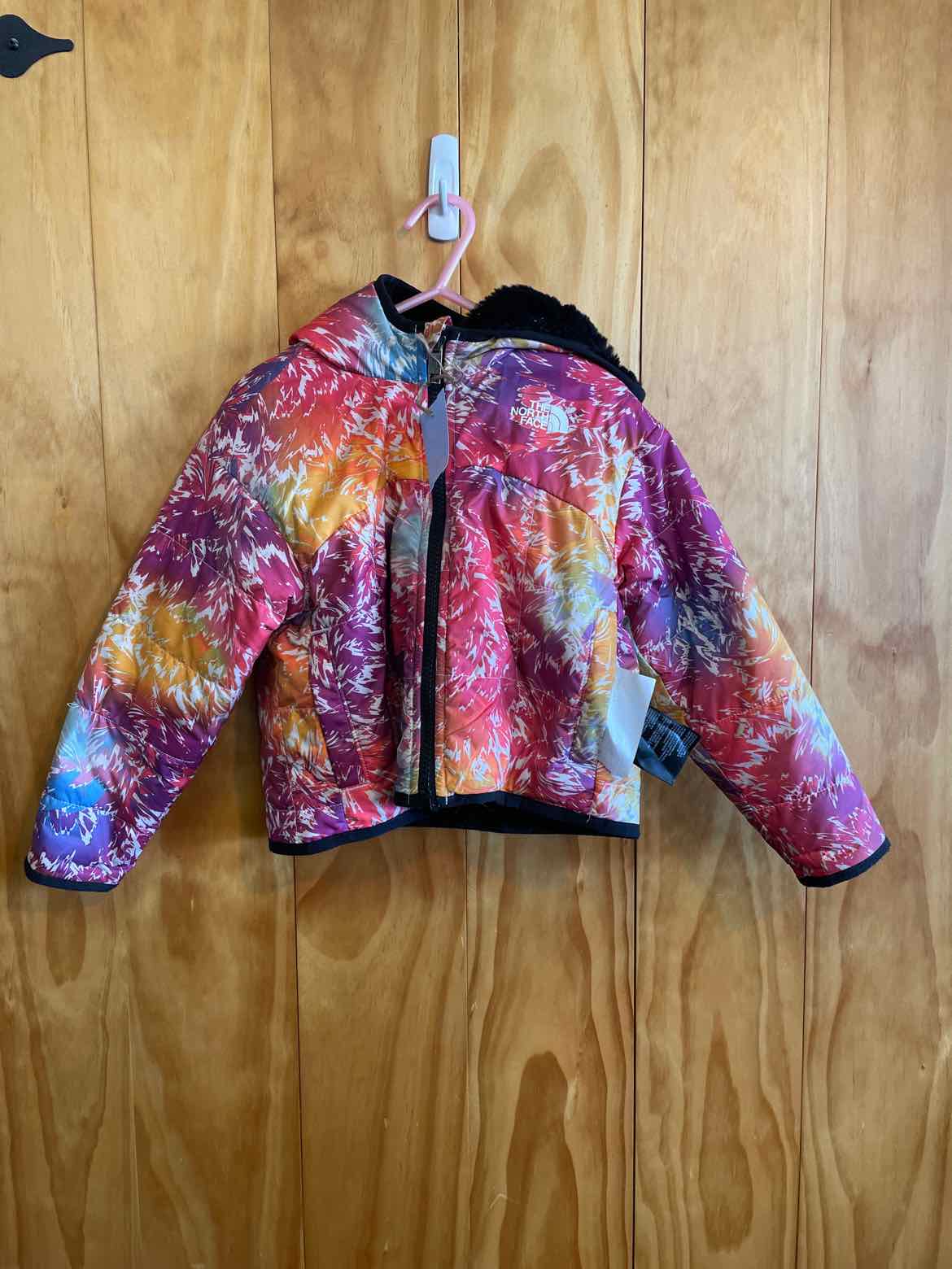 Reversable hooded full zip Jacket, black sherpa one side pink purple and yellow design puffer other side