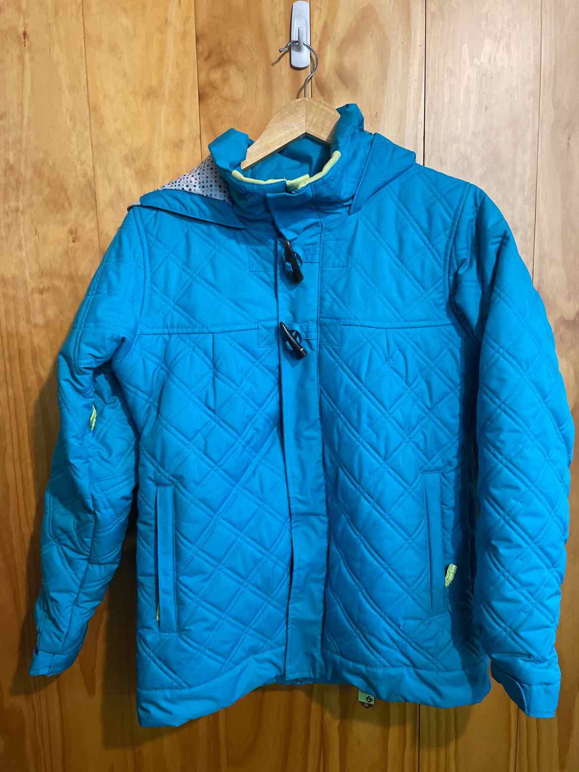 Quilted ski jacket with patterned inner and lime green accents