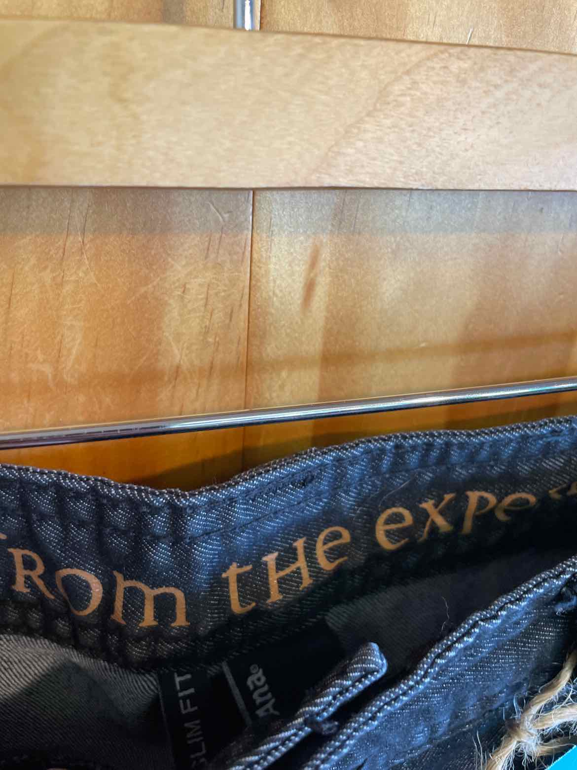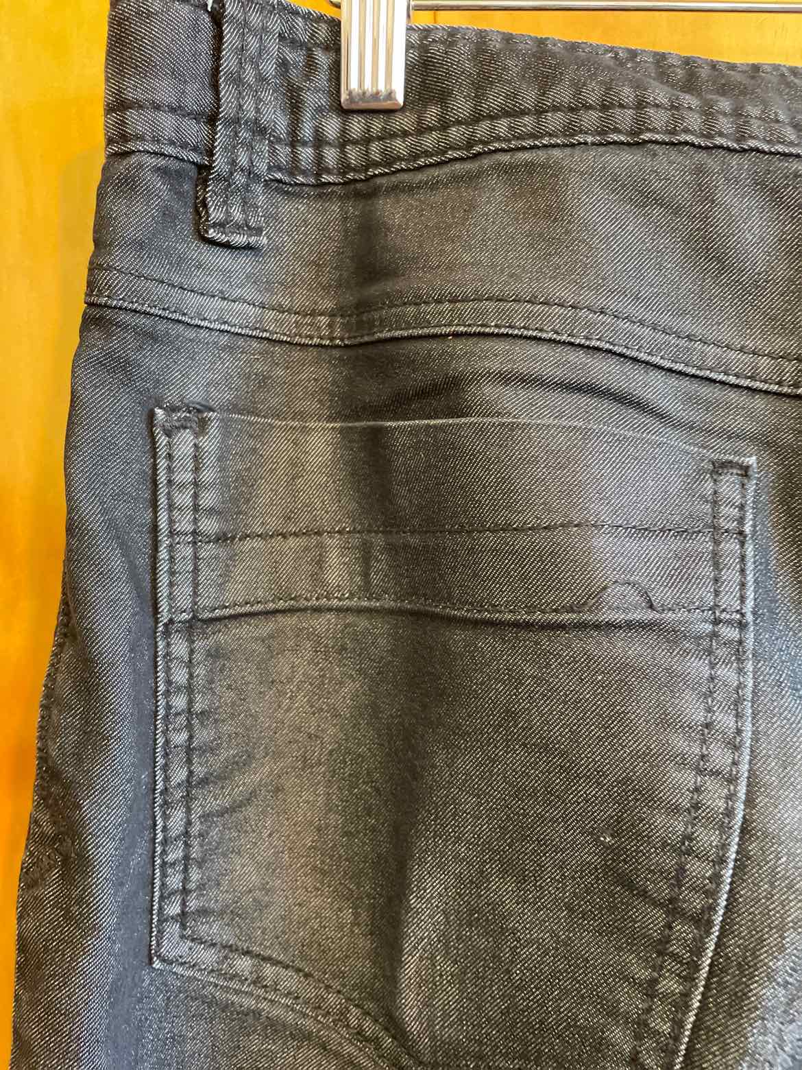 Slim fit black pants with black brand patch on back waistband. silver buttons