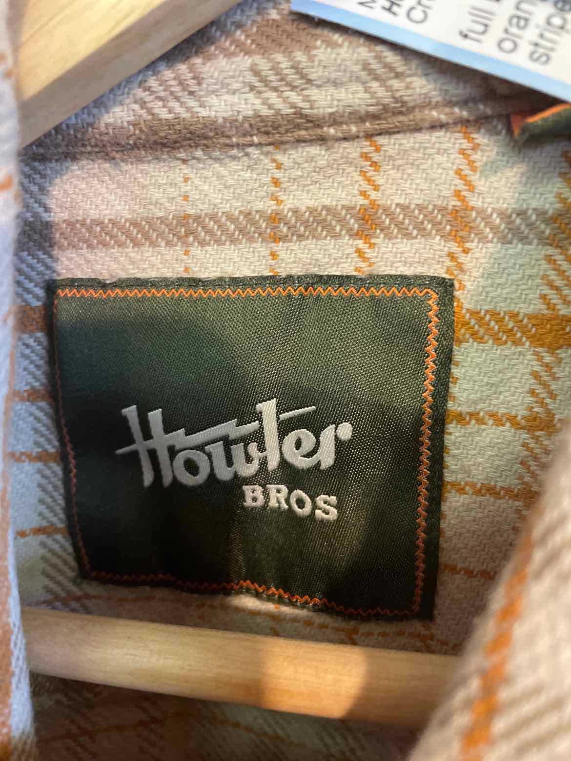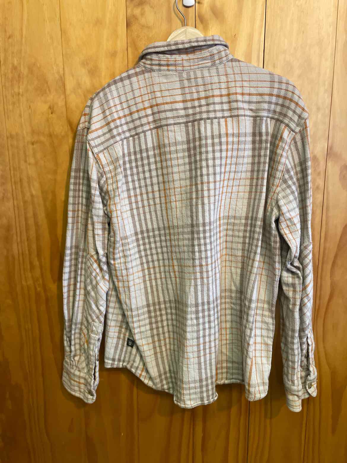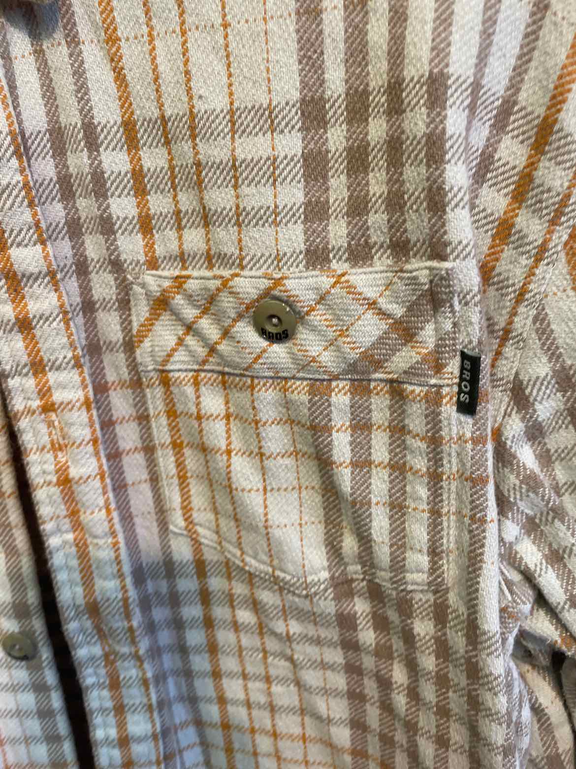 full button flannel with orange and light brown stripes