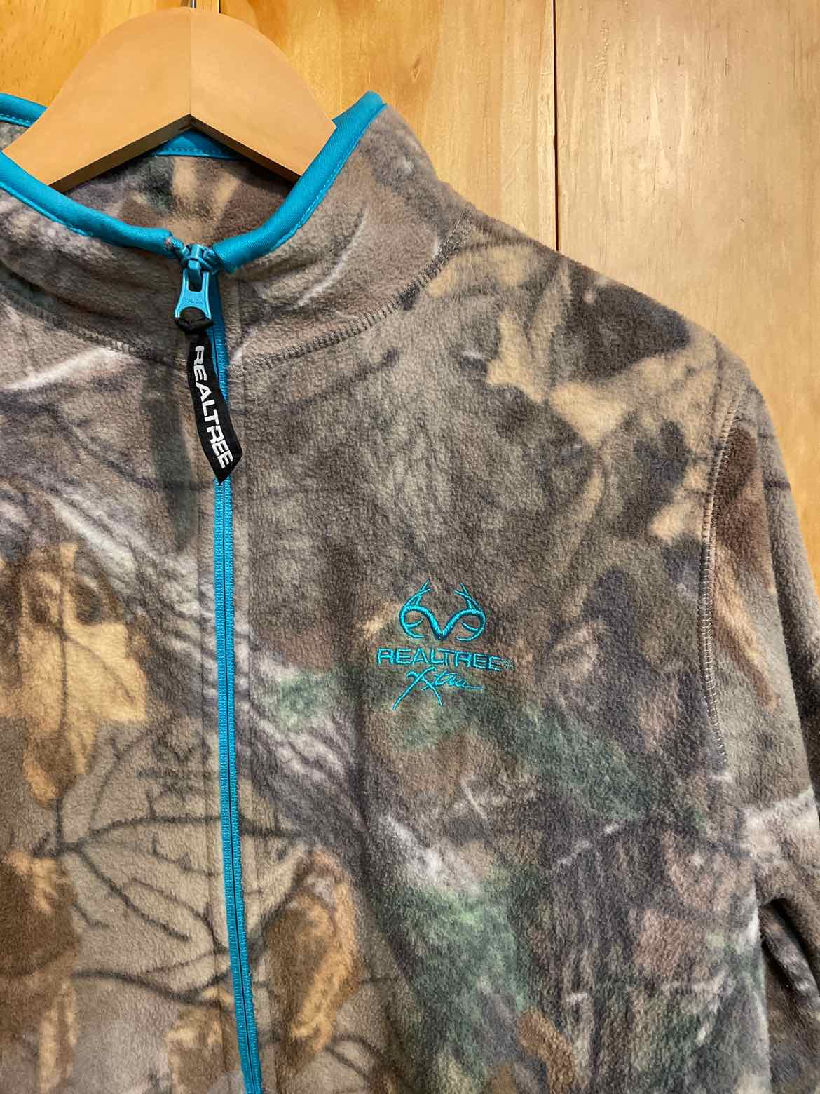 Full zip camo fleece with teal accents