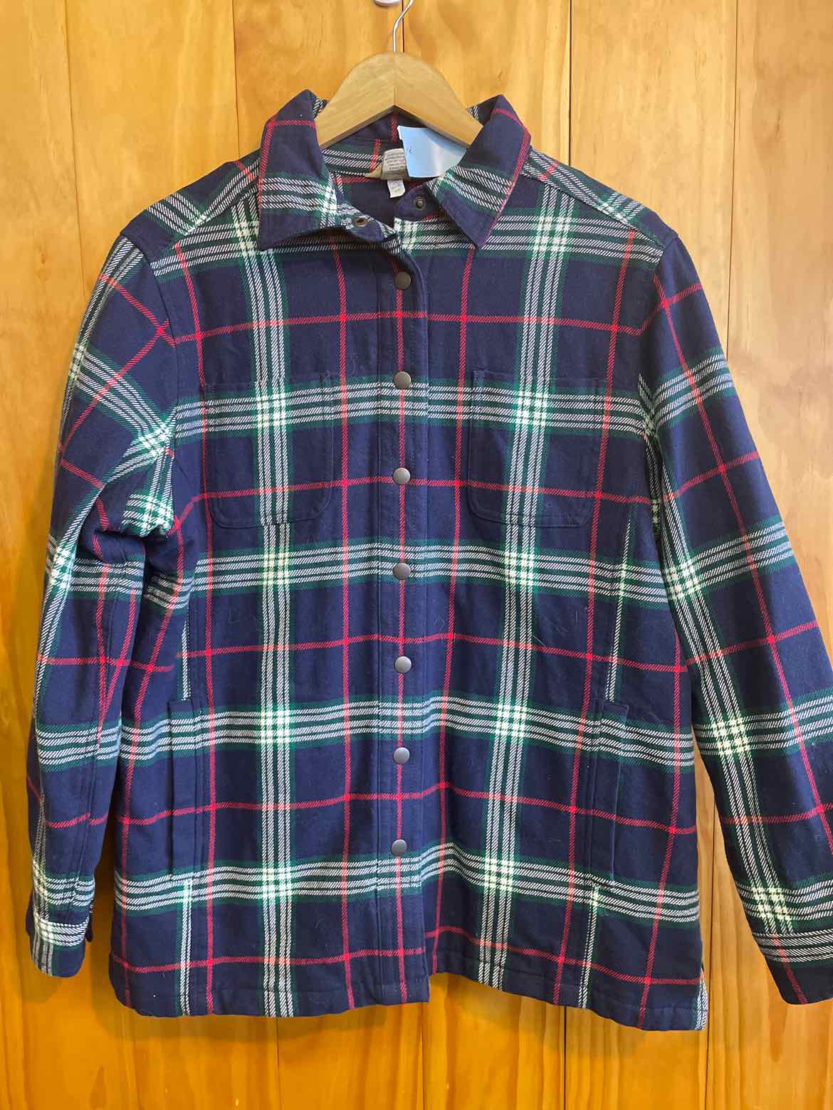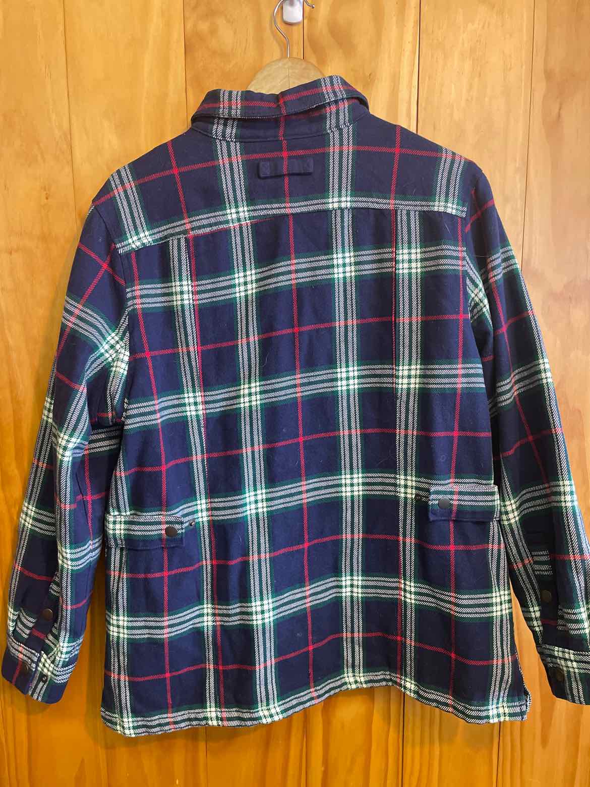 Quilted interior snap down flannel. size large. Navy, green and white