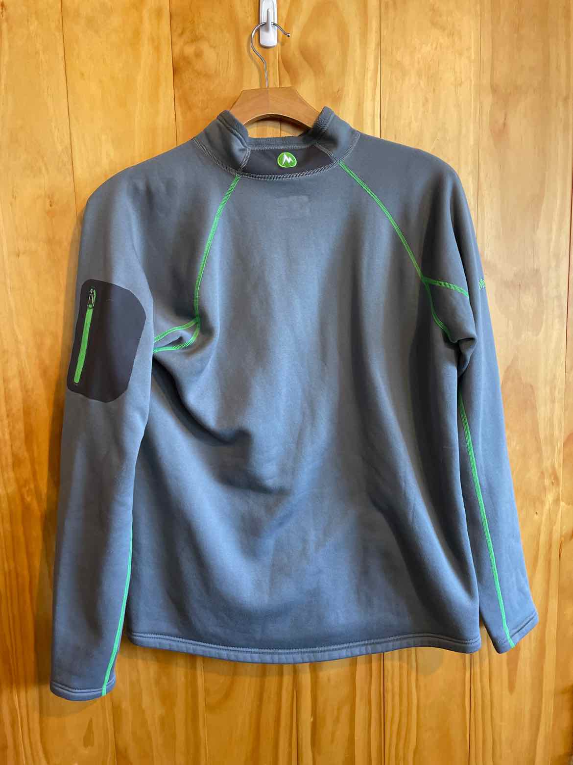 1/4 zip fleece with green accents. zip pocket on sleeve