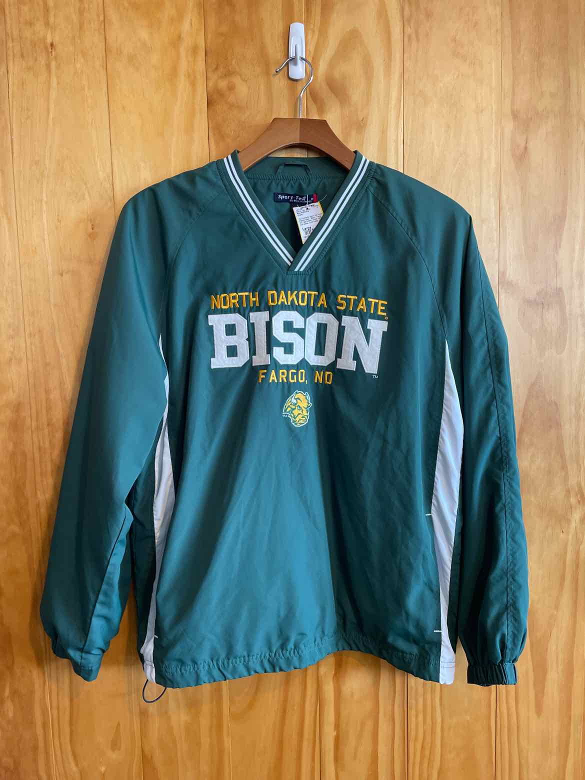 Port Authority Sport-Tek "North Dakota State - Bison - Fargo, ND" light jacket. Green, white, and yellow. Cinch waist. V-neck. Large.