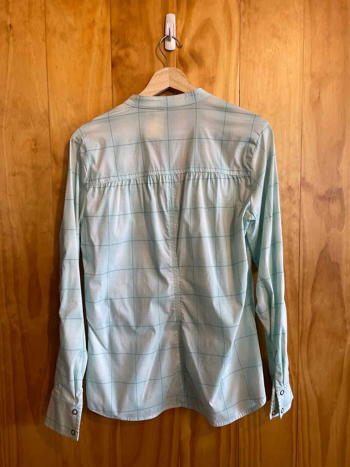 Athleta long sleeve button up shirt. Teel and white with grey grid pattern. Two small chest pockets. Medium.