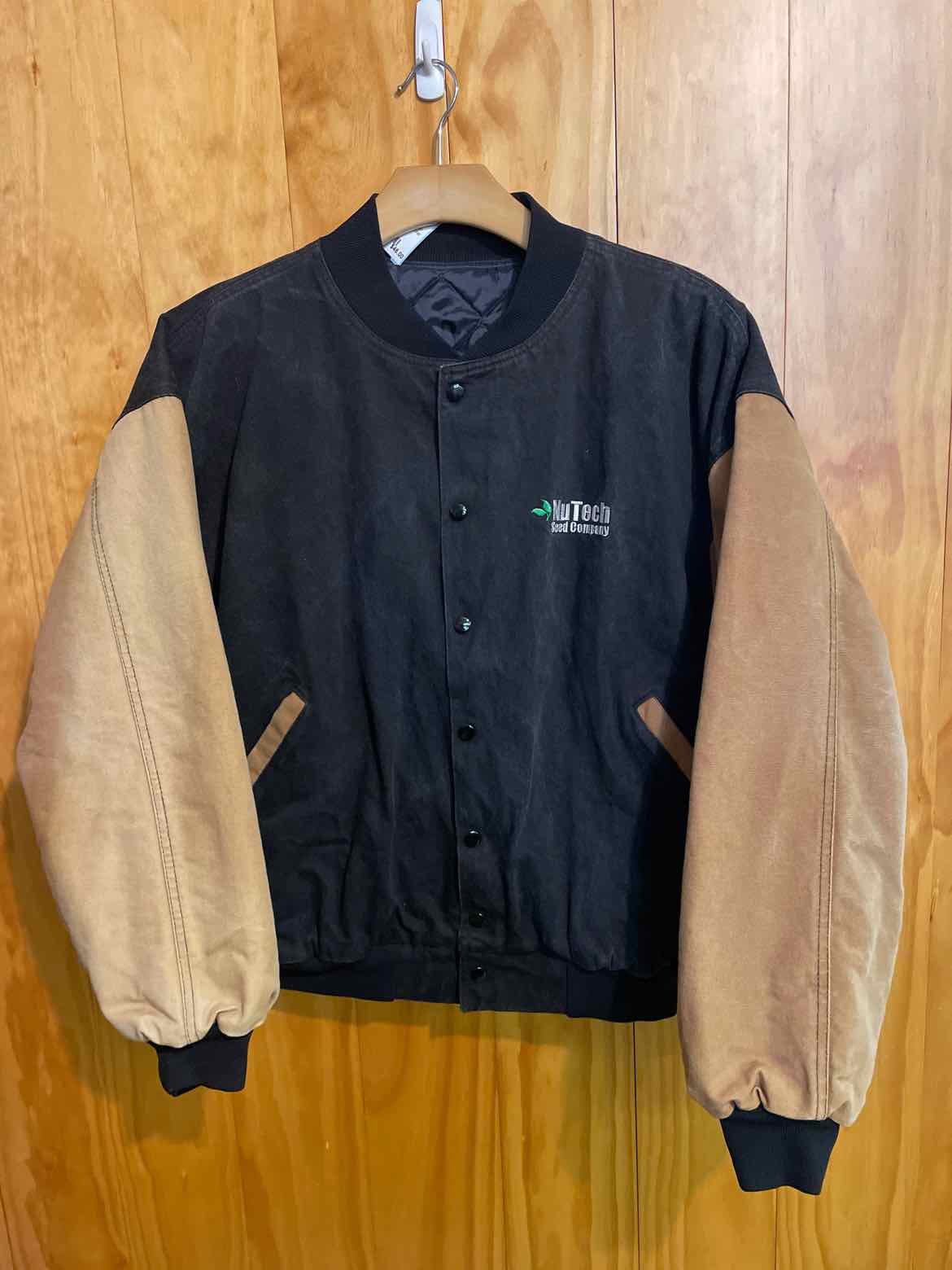 Black and tan snap down stadium jacket. NuTech Seed Company