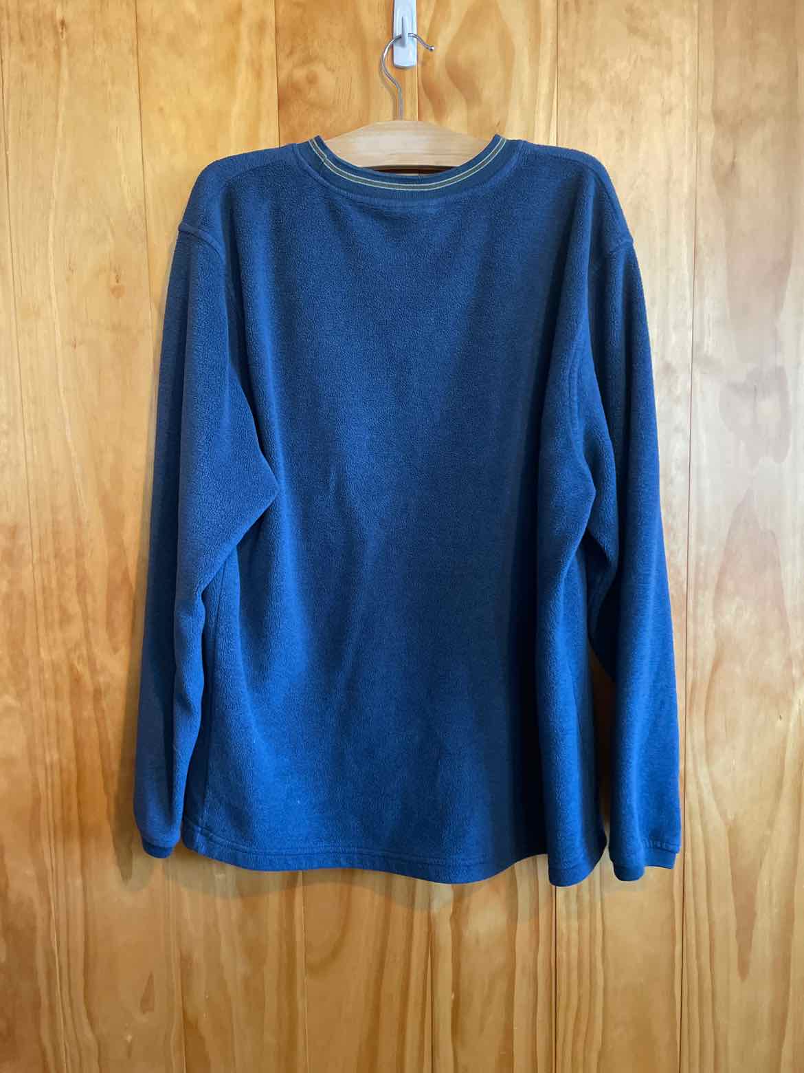 fleece long sleeve with front pocket and olive band around collar and pocket. no size
