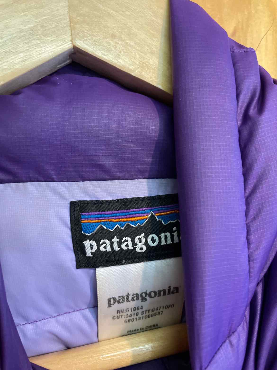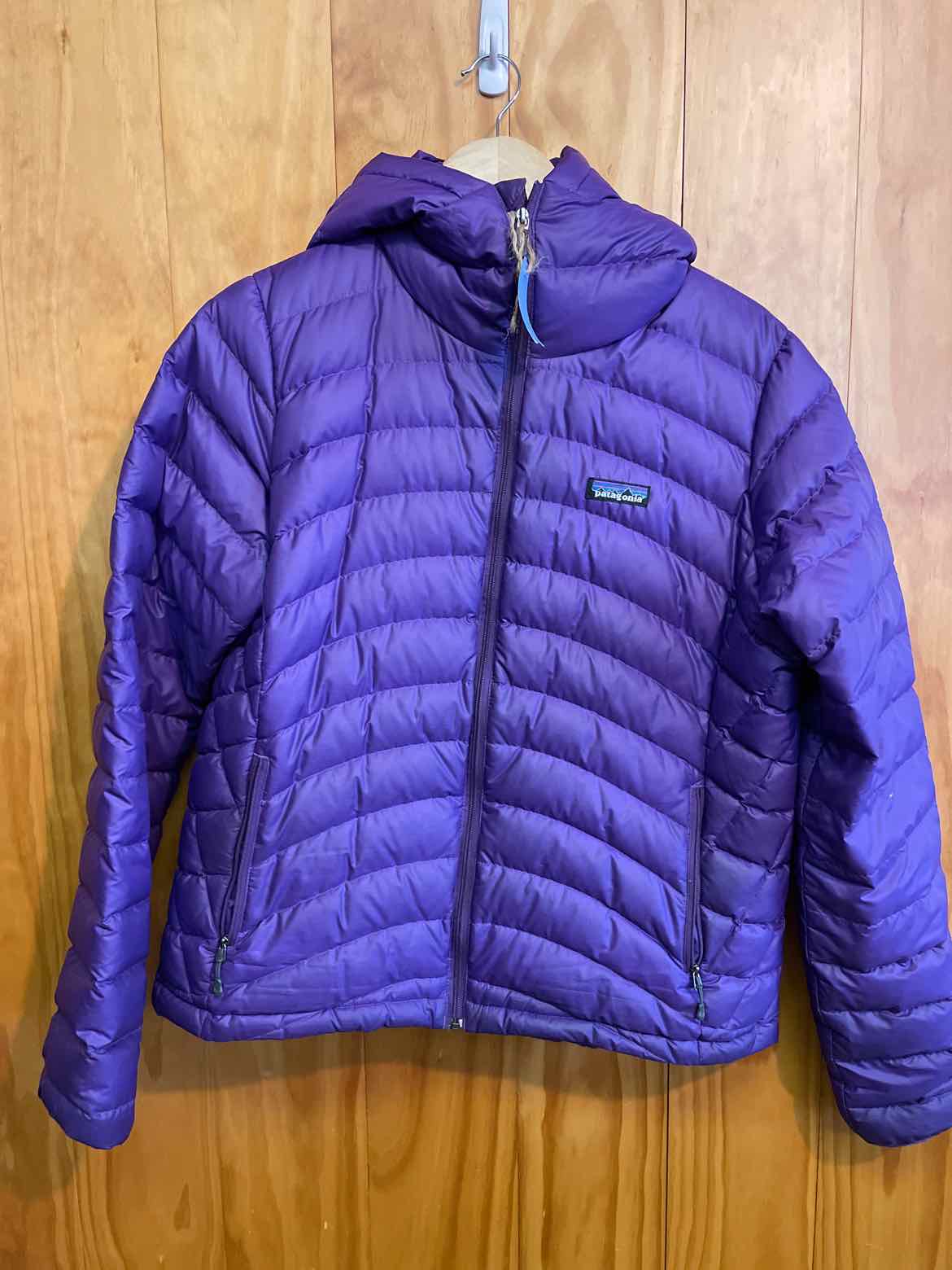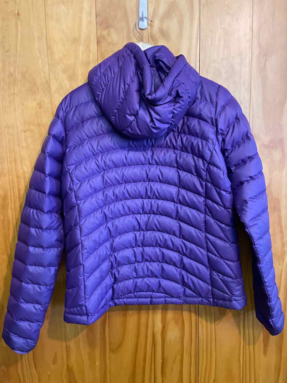 Full-zip hooded pufferjacket with lavender interior. has some marks on inside, sold as is