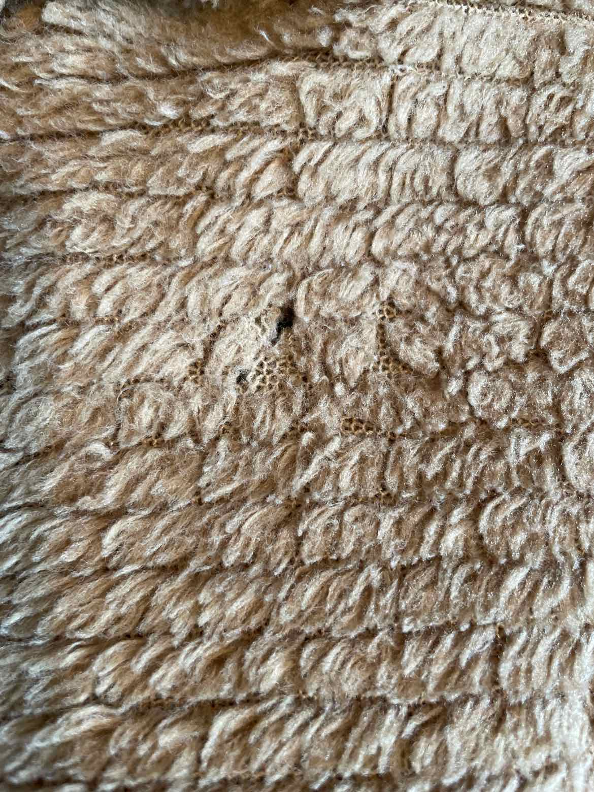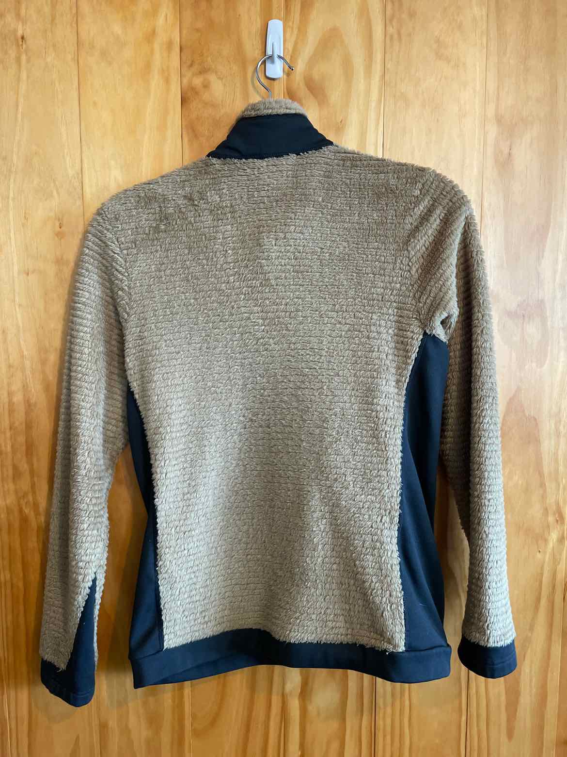Tan and black full-zip fleece. one chest pocket. Small tear by zipper, sold as is