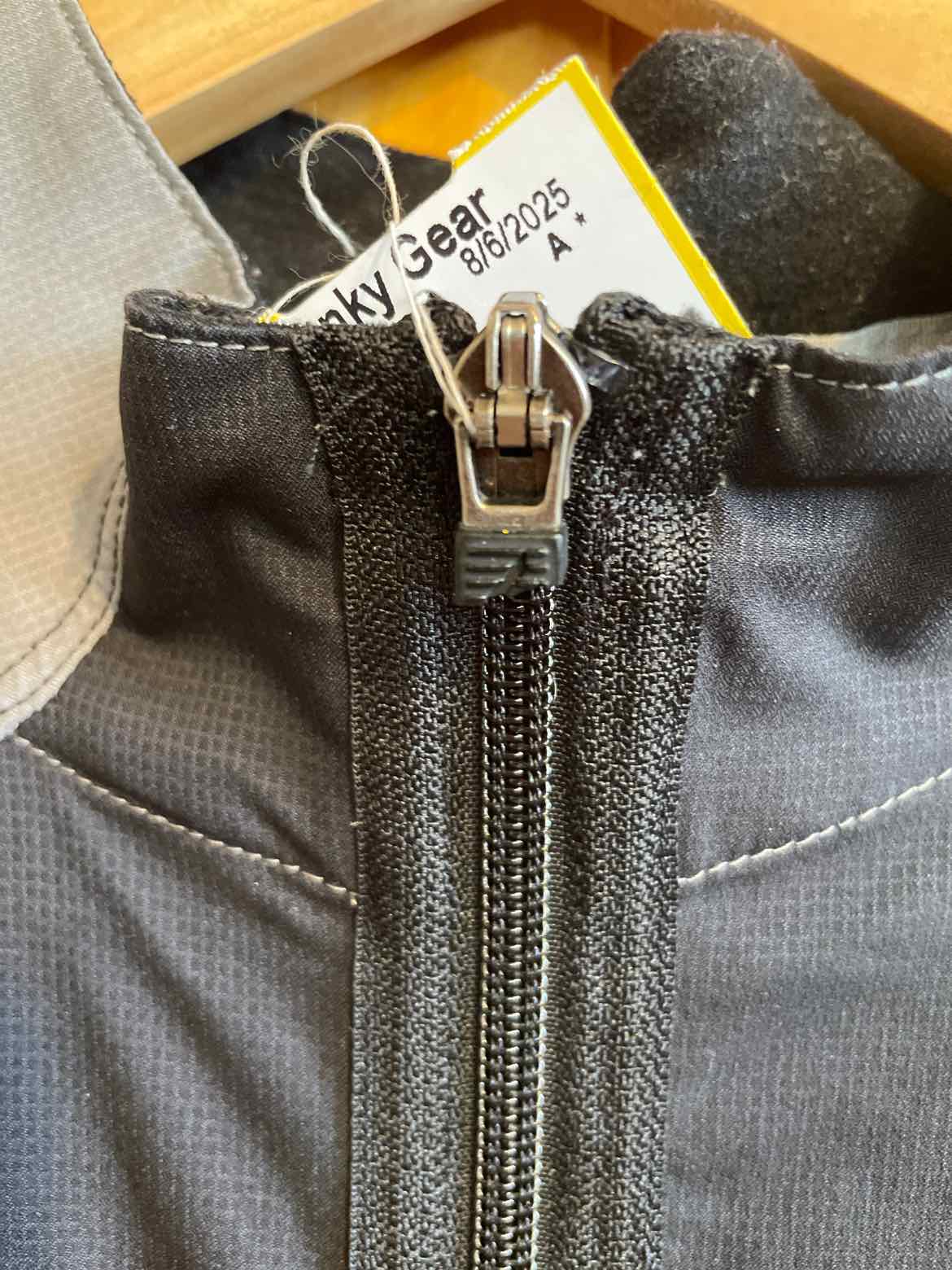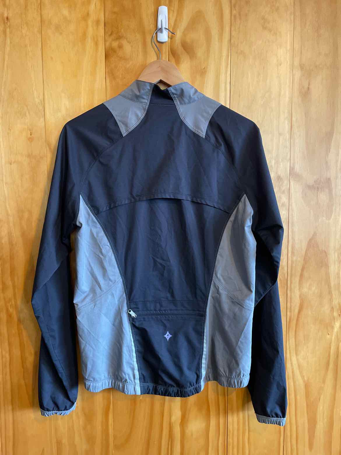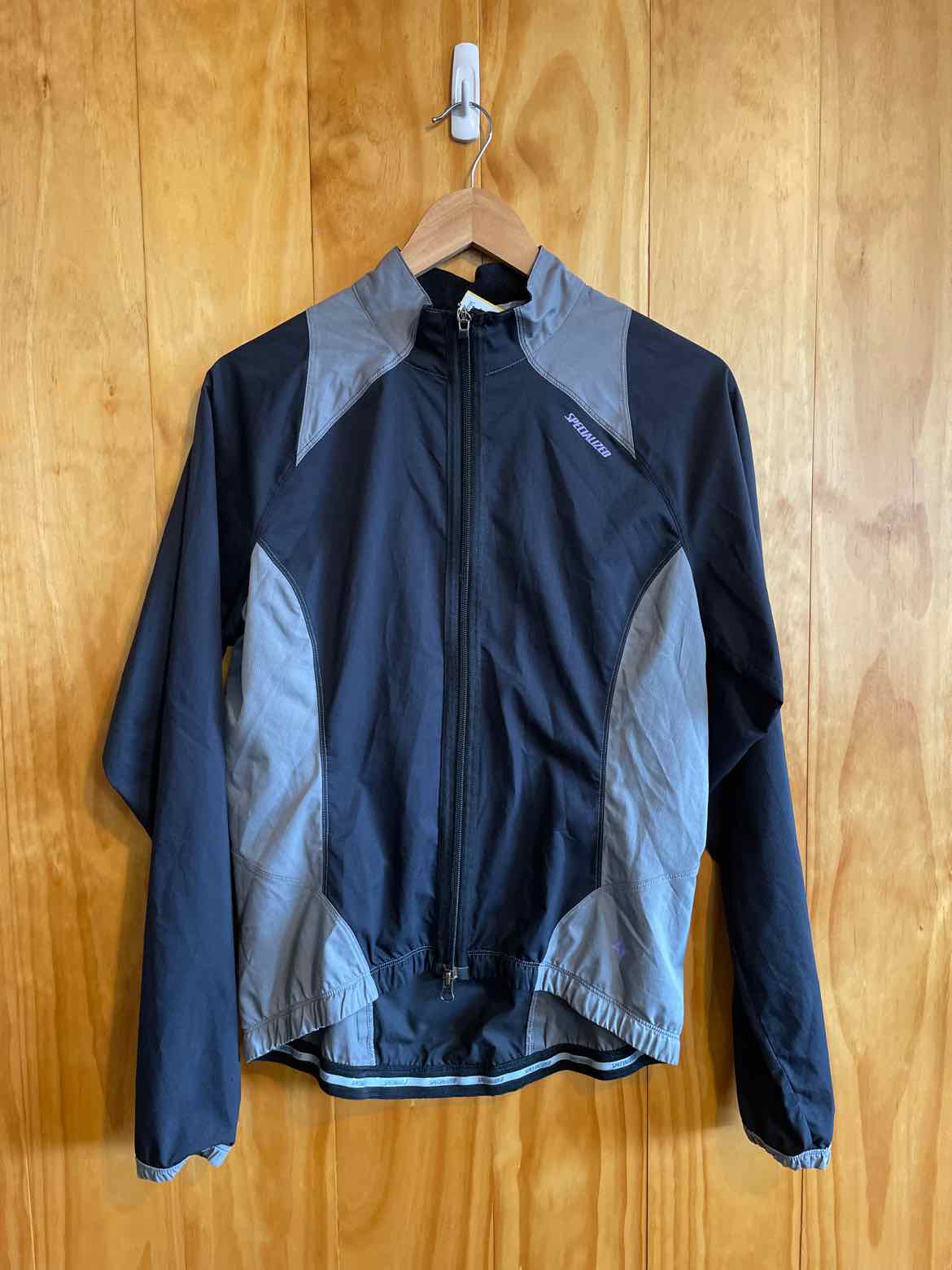 Specialized cycling light jacket. Black and grey with light purple logo. Zipper pull has broken in half. Size: unknown.