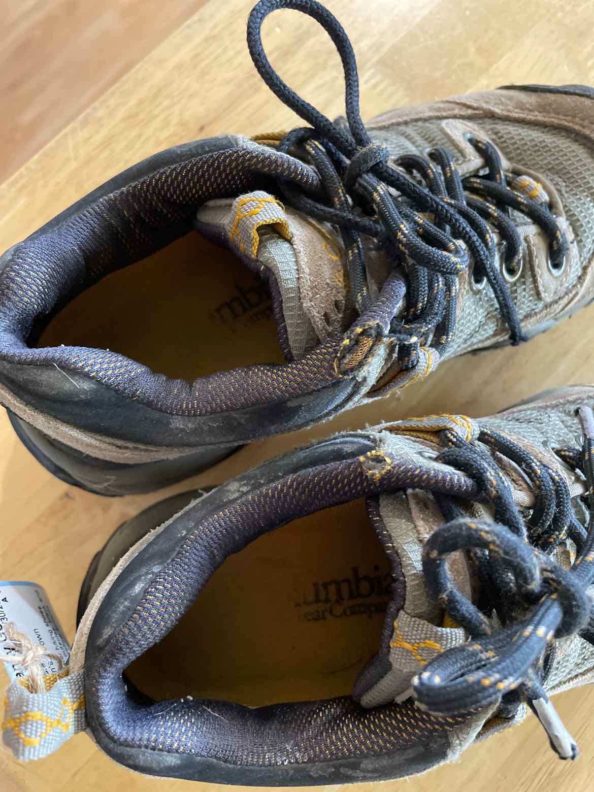 Trail Meister hiking shoes. Omni-Grip outsoles. black and brown with yellow accents