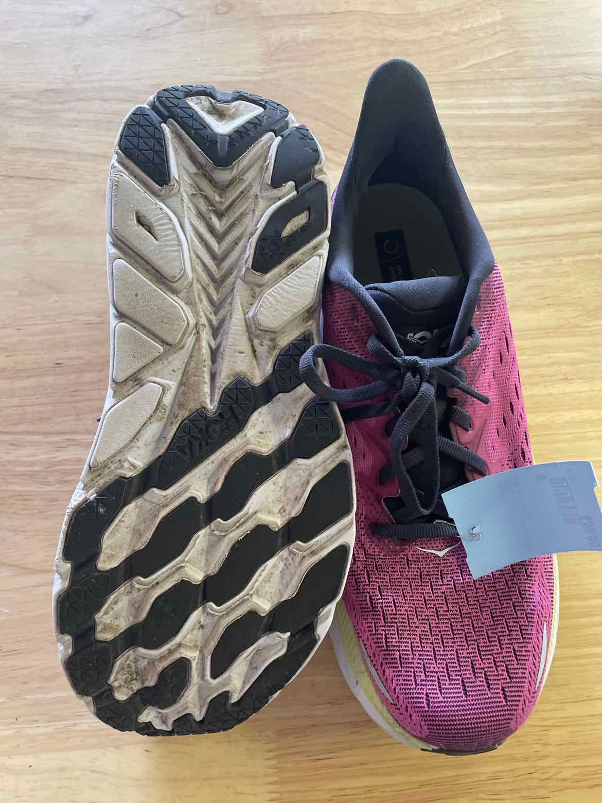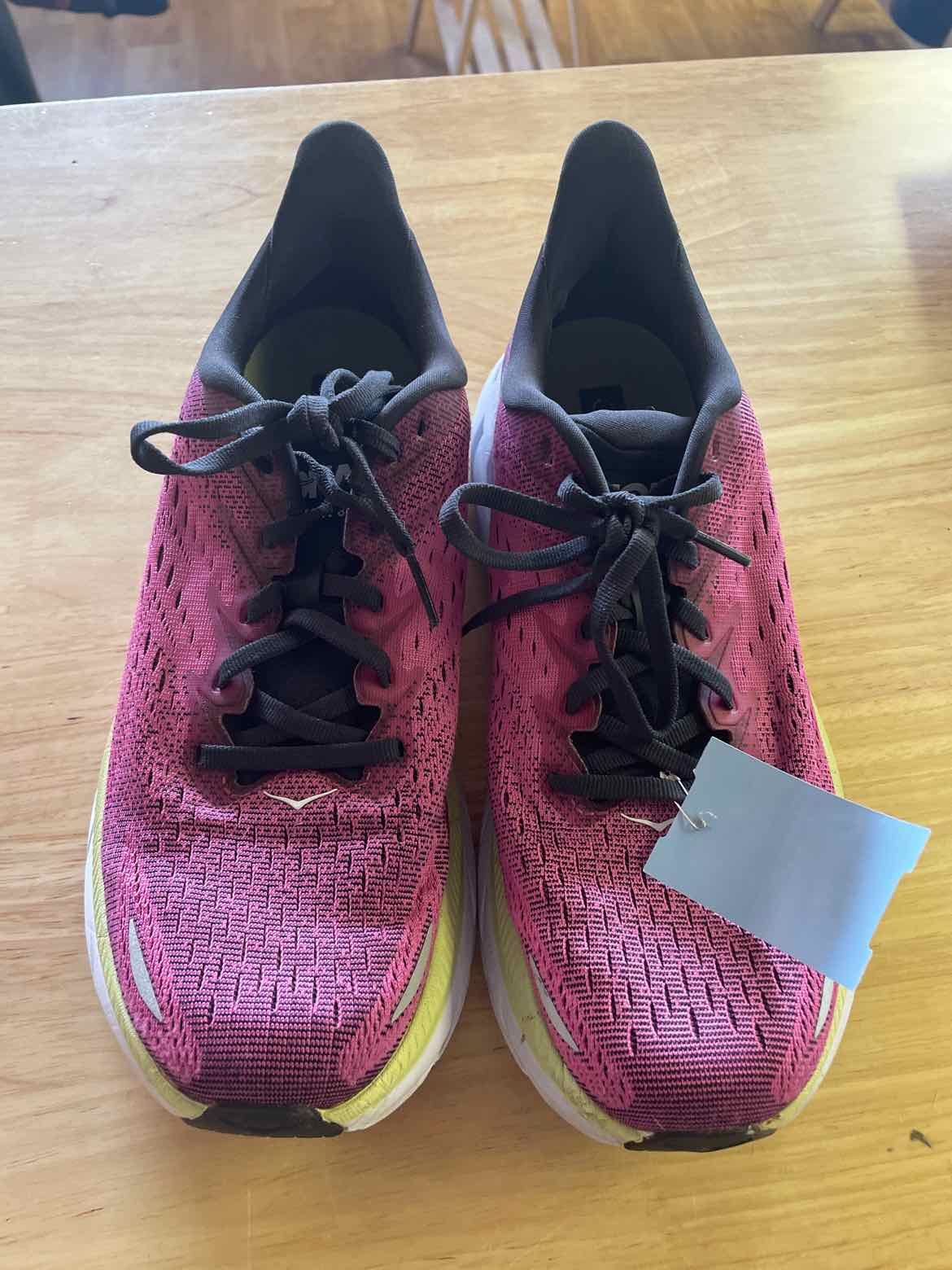 hoka clifton 8 running shoes with white and green sole and pink upper size 9