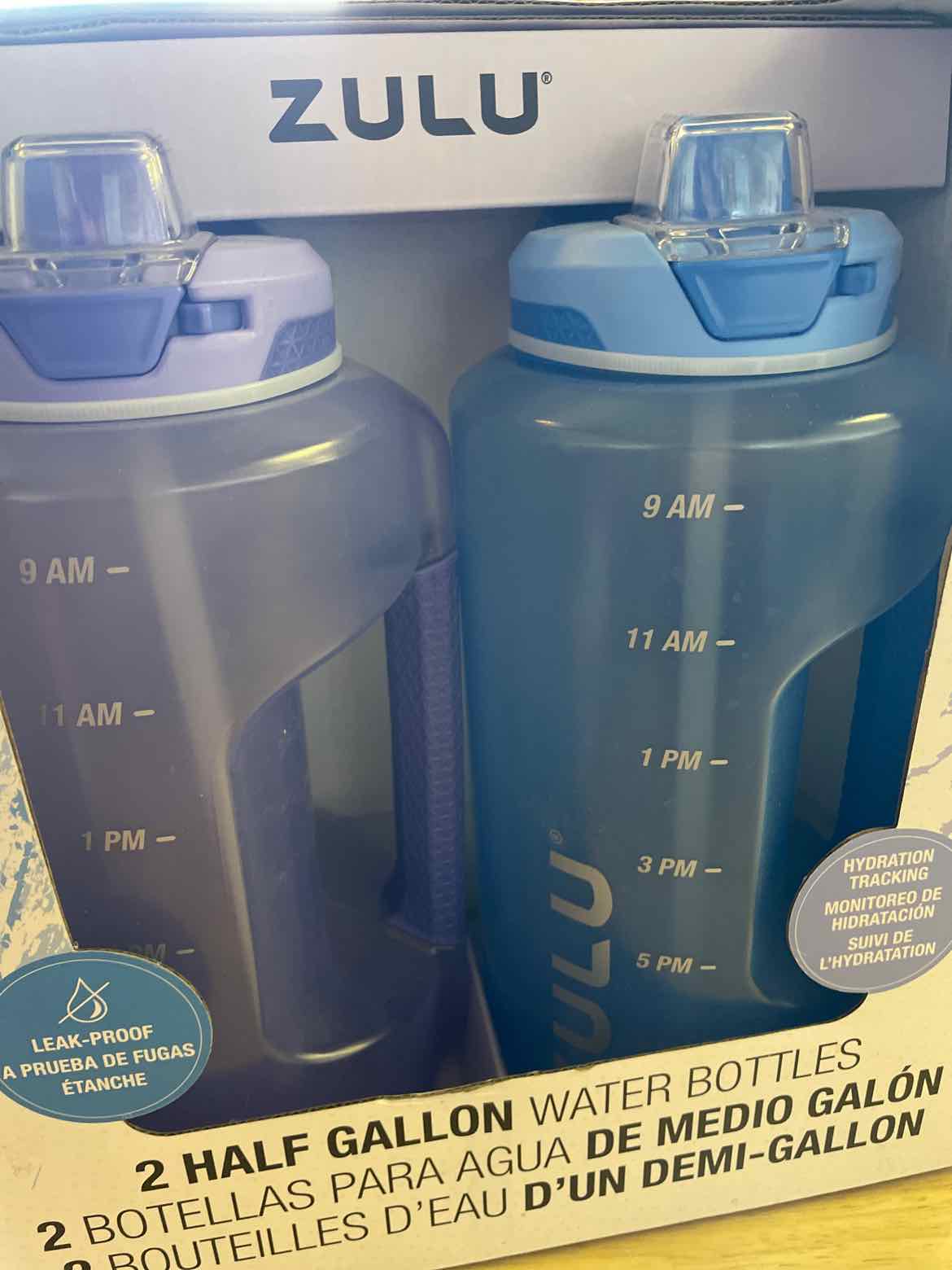 new in package 2 half gallon water bottles. purple and blue